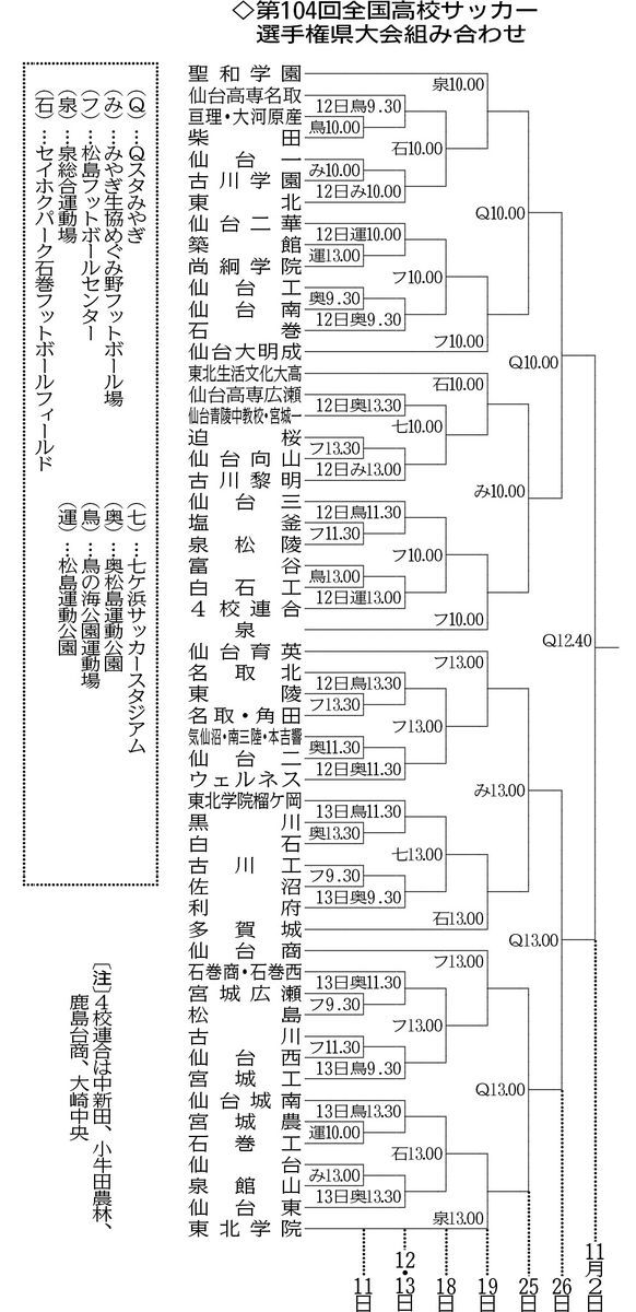 第104回全国高校サッカー選手権宮城県大会は11日、利府町のみやぎ生協めぐみ野フットボール場などで開幕する。55チームが出場し、トーナメントで全国切符を争う…