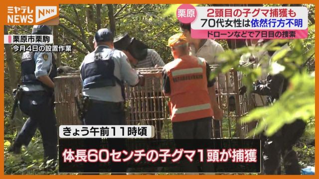 宮城・栗原市でクマに襲われたとみられる女性が行方不明となっている中、現場近くに設置したわなに2頭目となる子グマが、9日捕獲されました。