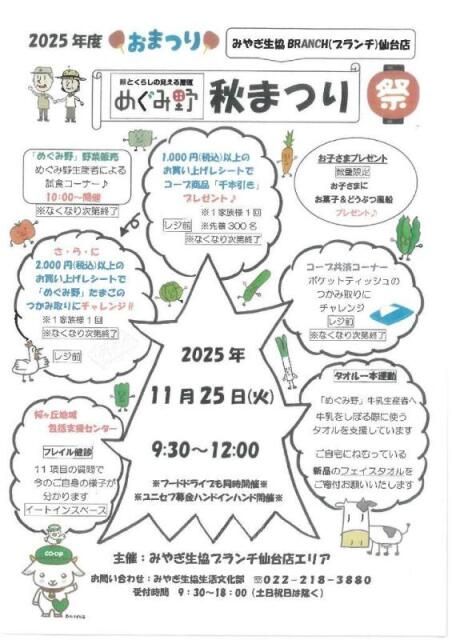 いかがお過ごしですか、nittaです。仙台市青葉区桜ヶ丘の『みやぎ生協BRANCH仙台』で、『めぐみ野秋まつり』を、2025年11月25日(火)に開催するみた…