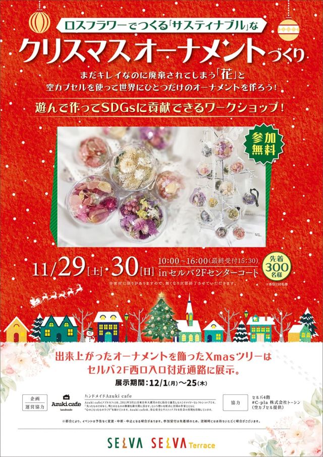 いかがお過ごしですか、nittaです。仙台市泉区泉中央のセルバ2階センターコートで、『ロスフラワーでつくる「サスティナブル」なクリスマスオーナメントづくり』を…