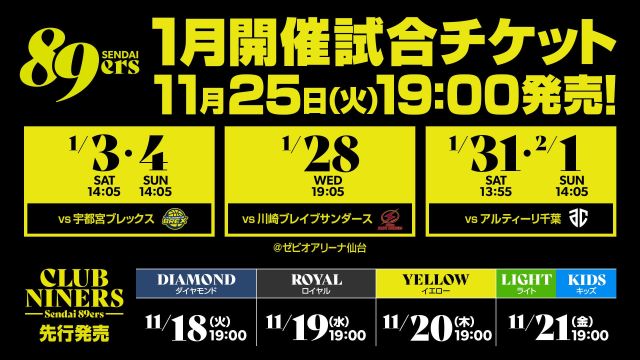 いつも仙台89ERSを黄援いただきありがとうございます。1月開催ホームゲーム5試合のチケット概要をお知らせいたします。1