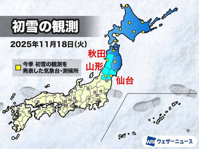 仙台管区気象台は18日午後、仙台で「初雪」を観測した。 平年より1日遅く、昨年より1日早い初雪となった。