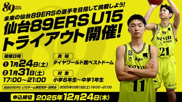 このたび、仙台89ERS U15チームでは、2025年度において小学6年生から中学1年生の男子を対象に「2026年度 仙台89E