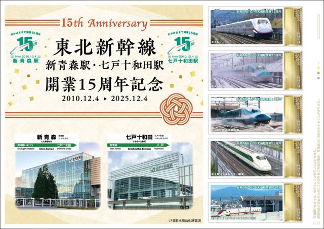 日本郵便東北支社(仙台市、斎藤貴支社長)は1日、東北新幹線新青森駅と七戸十和田駅の開業15周年を記念したオリジナルフレーム切手を発売した。 切手には、E5…