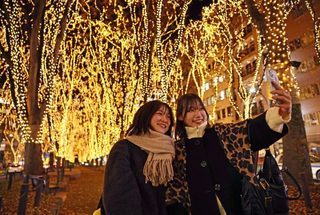 5日に開幕する「SENDAI光のページェント」を前に、実行委員会が2日夜、会場の仙台市青葉区の定禅寺通でイルミネーションを試験点灯した。通りがかった市民らが…