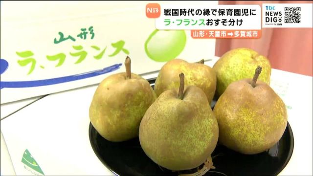 宮城県多賀城市の保育園に、友好都市の山形県天童市から名産のラ・フランスが贈られました。11日、山形県天童市から、0歳から6歳児45人が通っている多賀城市の桜木…