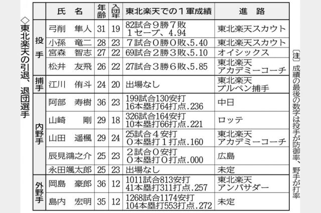 東北楽天は今季限りで岡島豪郎、島内宏明の両外野手ら日本人12選手の引退、退団が決まった。 岡島は2012年に白鴎大からドラフト4位で入団し、13年に1番打者…