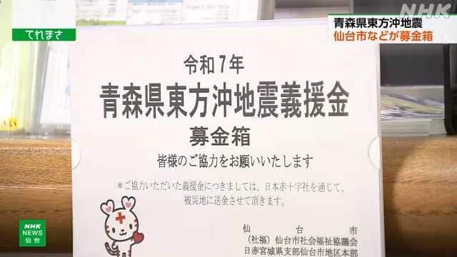 【NHK】先月、最大震度6強の揺れを観測した青森県東方沖を震源とする地震で被害を受けた地域を支援しようと、仙台市などは6日から市役所や区役所などに募金箱を設置…