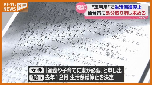 車の利用を理由に生活保護の停止処分を受けた女性(30代)が、仙台市に対し処分の取り消しを求める訴えを起こしました。