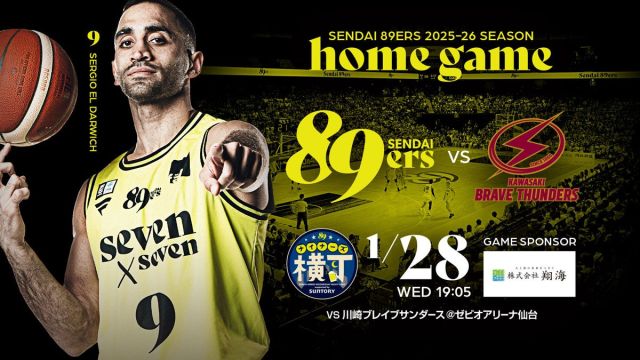 プロバスケットボールBリーグ1部に所属する仙台89ERSのホームゲーム!1/28(水) は、ゼビオアリーナ仙台で、川崎ブレイブサンダースを迎え撃つ!ぜひゼビオ…