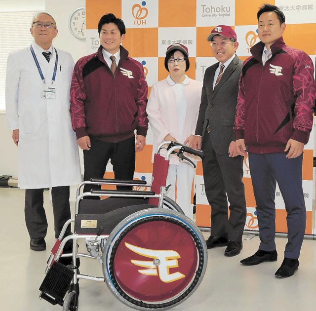 東北楽天球団アンバサダーの銀次さんと岡島豪郎さんが22日、仙台市青葉区の東北大病院を訪れ、チームカラーのクリムゾンレッドに彩られた車いすを寄贈した。 前年シ…