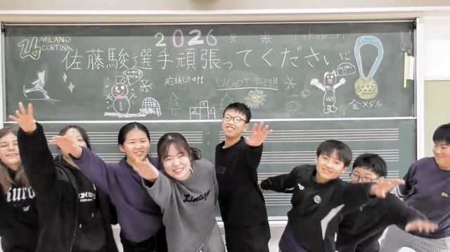 ミラノ・コルティナ冬季五輪フィギュアスケート男子日本代表の佐藤駿選手(22)=エームサービス・明大、仙台市出身=の活躍を願い、母校の仙台市高森小の児童らが応…