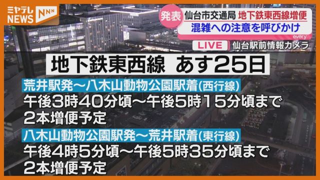 25日~26日に国公立大学2次試験が実施されるのに伴い、仙台市交通局は地下鉄東西線の増便を発表し、混雑への注意を呼びかけています。