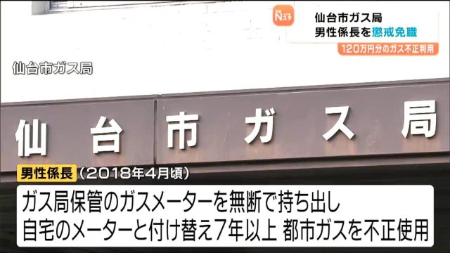 勤務する仙台市ガス局からガスメーターを無断で持ち出して、自宅のメーターと定期的に付け替えることで使用量をごまかし、合わせて120万円分以上の都市ガスを不正使用…