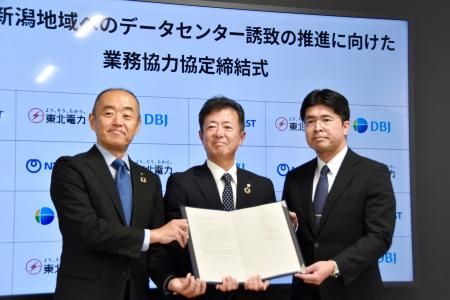 東北電力、NTT東日本、日本政策投資銀行は16日、東北・新潟地域へのデータセンター誘致を推進するため、業務協力協定を締結した。冷涼な気候などデータセンターに…