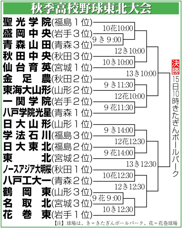 来春センバツの参考材料にもなる秋季東北大会(9日開幕、岩手)の組み合わせが決まった。連覇を目指す聖光学院(福島1位)の初戦は盛岡中央(岩手3位)-青森山田(青…