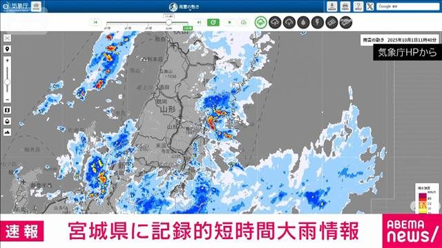 10月1日午前11時40分、宮城県に記録的短時間大雨情報が発表されました。レーダーによる解析で、仙台市宮城野区付近で1時間におよそ100ミリの記録的な大雨にな…