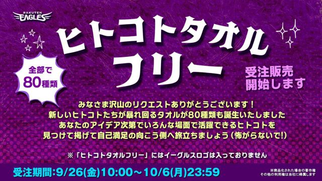 【9/26(金)】ヒトコトタオルフリー受注販売決定!!@オンラインショップ - 東北楽天ゴールデンイーグルス