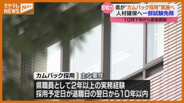 宮城県は、即戦力となる人材の確保に向け退職した元職員を対象に一部の試験を免除する「カムバック採用」を実施することを決めました。