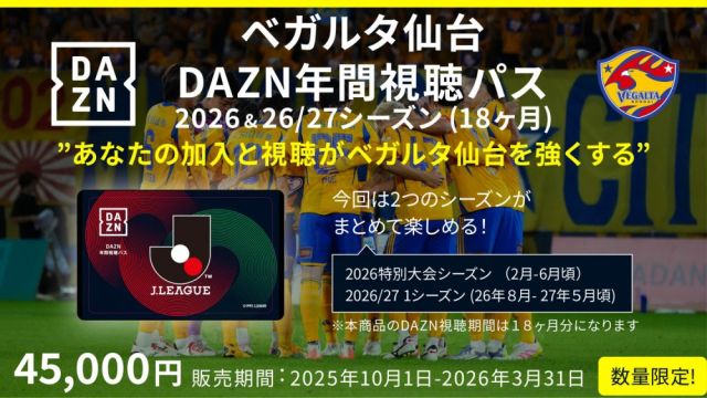 ベガルタ仙台 DAZN年間視聴パス2026&2026/27シーズン(18か月分) 数量限定販売のお知らせ