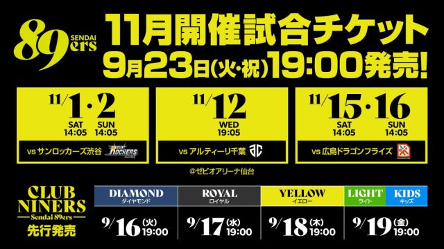 いつも仙台89RSを黄援いただきありがとうございます。11月開催ホームゲーム5試合のチケット概要をお知らせいたします。&