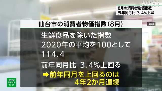 【NHK】家庭で消費するものやサービスの値動きを見る仙台市の消費者物価指数は、先月生鮮食品を除いた指数が食料品の値上がりなどの影響で去年の同じ月より…