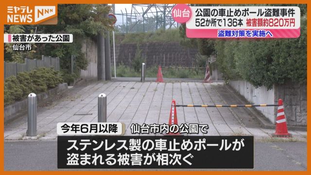 公園の車止めポールの盗難事件を受けた仙台市の緊急点検で、被害額が820万円にのぼることが分かりました。市は今後、盗難対策を行う方針です。