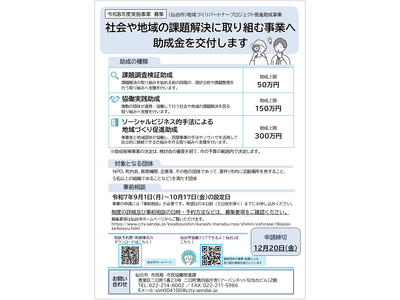 令和8年度「地域づくりパートナープロジェクト推進助成事業」募集中 社会情勢の変化に伴い、地域の抱える課題が複雑さ・多様さを増している中において、まちの持…