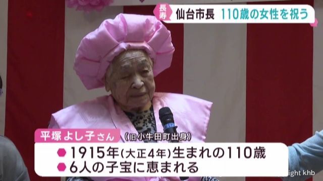 敬老の日の15日、郡仙台市長が、市内に住む110歳の女性のもとを訪れ、長寿を祝いました。 ピンクの帽子とちゃんちゃんこ姿で登場したのは、110歳の平塚よし子…