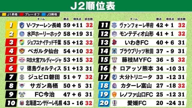 サッカーJ2リーグは、4日(土)、5日(日)に第32節の10試合が行われました。