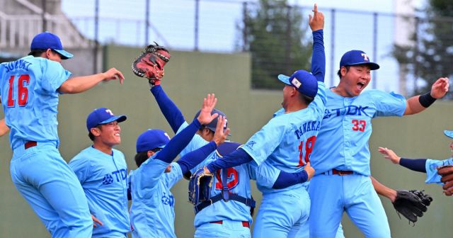 【トヨタ自動車東日本-TDK】優勝し喜ぶTDKの選手たち=仙台市民球場で2025年10月5日、西夏生撮影
