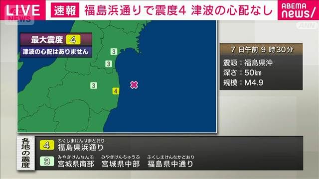 午前9時30分ごろに福島県浜通りで震度4の地震がありました。 震源地は福島県沖で、地震の規模(マグニチュード)は4.9と推定されます。 この地震による津波の心…