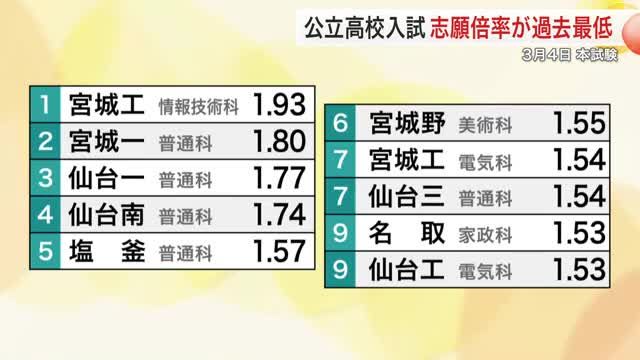 1月21日、3月に行われる公立高校入試の志願状況が発表されました。全日制の平均志願倍率は0.96倍で、過去最も低くなりました。 宮城県が21日に発表した、3…