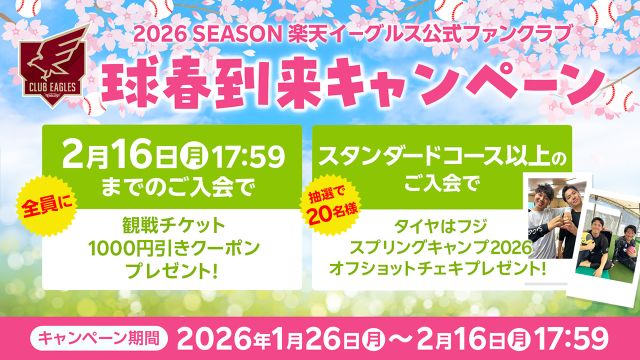株式会社楽天野球団(本社:宮城県仙台市宮城野区、代表取締役社長:森井 誠之)は、お子さま向け公式ファンクラブ「イーグルスキッズクラブ」の入会受付を2月2日(月…