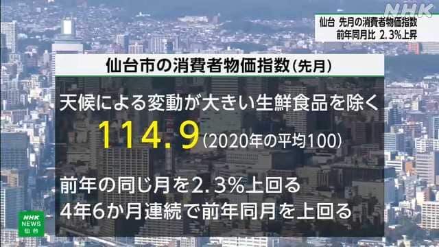 【NHK】家庭で消費するものやサービスの値動きを見る仙台市の消費者物価指数は、先月、生鮮食品を除いた指数が前の年の同じ月より2.3%上昇しました。 総務省に…