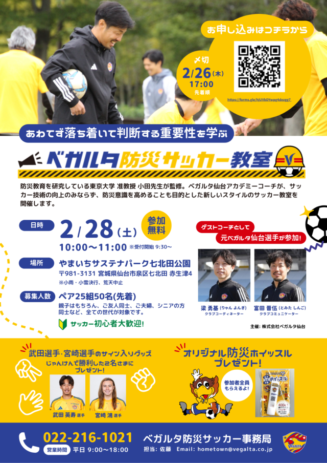 2月28日(土)「ベガルタ防災サッカー教室 in やまいちサステナパーク七北田公園」参加者募集のお知らせ