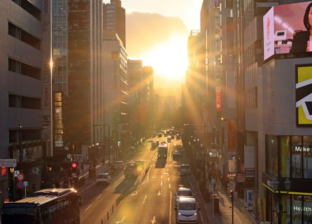 仙台市中心部のビルの谷間に夕日が沈む「センダイヘンジ」が、冬季の見頃を迎えている。 青葉区の南町通では19日、西の空で雲が流れた瞬間、切れ目から太陽の光が夕…