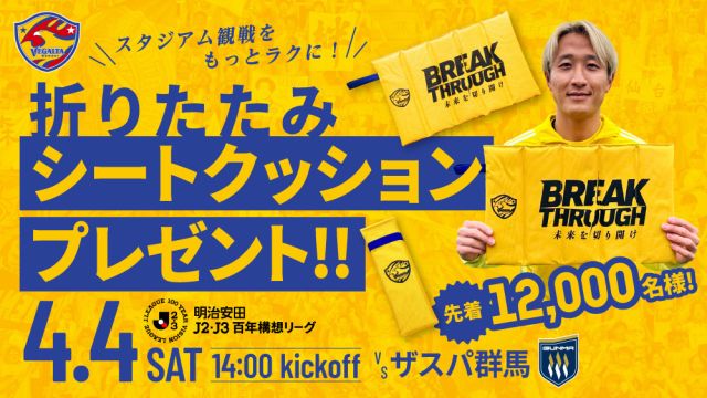 【4月4日 J2J3 群馬戦】「折りたたみシートクッション」来場者先着12,000名さまプレゼントのお知らせ