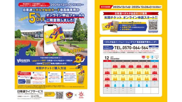 【日専連からのお知らせ】日専連ベガルタ仙台カード限定 年間チケットご請求時5%OFFのお知らせ