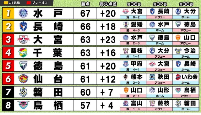 サッカーJ2リーグの第36節が8日、9日に各地で開催。残り2節となる中、上位陣は大混戦となっています。