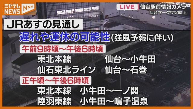 JR東日本によりますと、11月7日は強風の予報に伴い在来線の一部で、運休や遅れが発生する可能性があると、発表しました(発表は6日午後4時現在)。