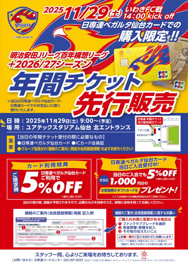 【11月29日 J2 いわき戦】日専連ベガルタ仙台カード限定 明治安田Jリーグ百年構想リーグ+2026/27シーズン 年間チケット先行販売開催のお知らせ