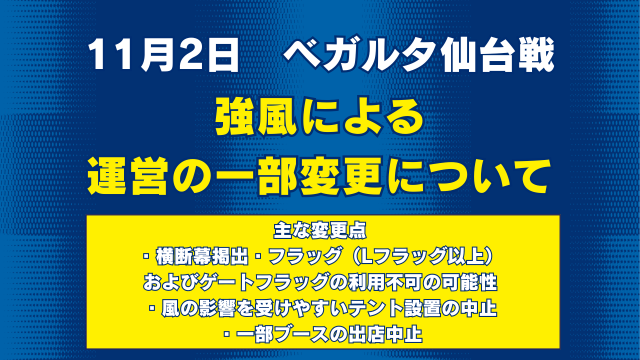 【公式】FC今治の「強風による運営の一部変更について(11月2日 仙台戦)|ニュース」ページです。公式サイト内では、試合速報、スケジュール、チケット情報、イベ…