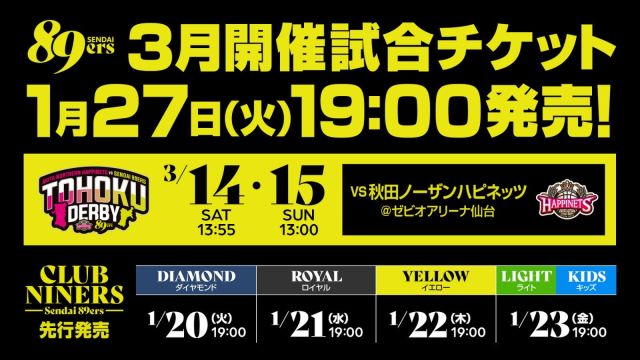 いつも仙台89ERSを黄援いただきありがとうございます。3月開催ホームゲーム2試合のチケット概要をお知らせいたします。3