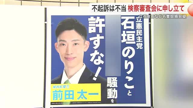 選挙ポスターを通じた名誉毀損容疑で書類送検され、昨年12月に不起訴となった政治団体「NHKから国民を守る党」の立花孝志党首ら3人に対し、立憲民主党の石垣のり…