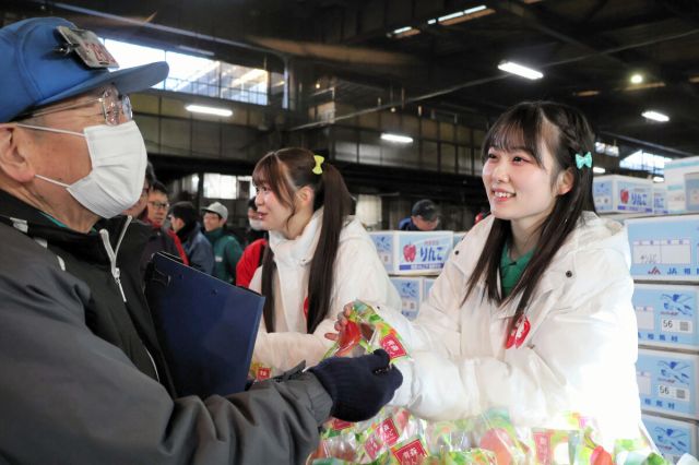 仙台市中央卸売市場(若林区)で21日、弘前産リンゴをアピールするイベント「パワーアップる!弘前産りんごPRキャラバン」があった。 青森県弘前市のご当地アイド…