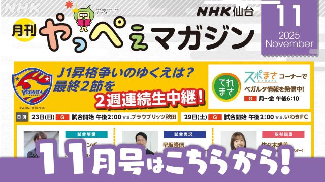 ベガルタ仙台・最終2節を2週連続生中継!昇格争いのゆくえは?NHK仙台11月のおすすめ番組&イベントをご案内。