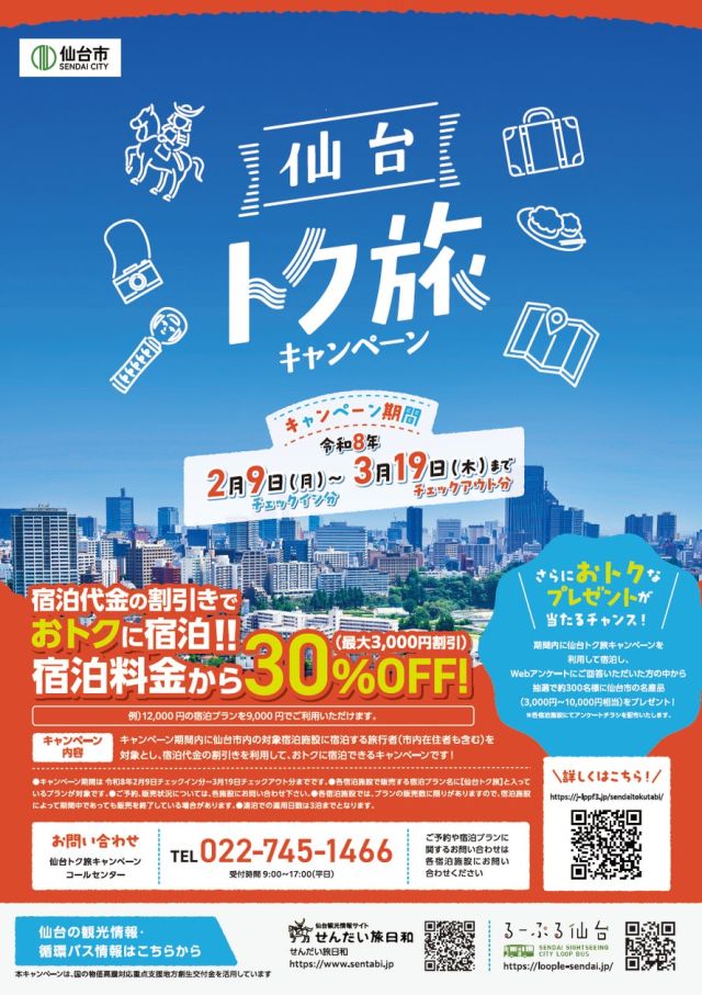 仙台市のプレスリリース(2026年2月2日 11時00分)仙台市「トク旅」キャンペーン<第2期>を開始、2月9日~3月19日まで宿泊代金割引