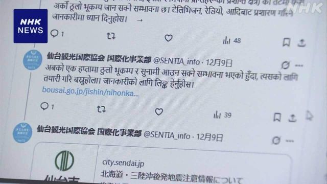 【NHK】「北海道・三陸沖後発地震注意情報」の発表を受けて、仙台市で暮らす外国人を支援する団体はメールやSNSを通じて情報の内容を6か国語で発信しました。 …